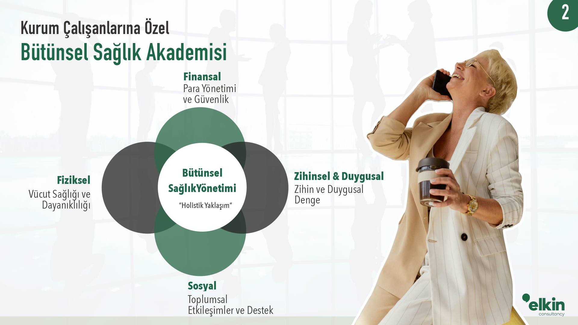 Kurumların ihtiyaçlarına özel olarak tasarlanan Bütünsel Sağlık Akademisi, çalışanların fiziksel, zihinsel ve sosyal yönden tam iyilik halini destekleyen eğitim ve uygulamaları kapsar.