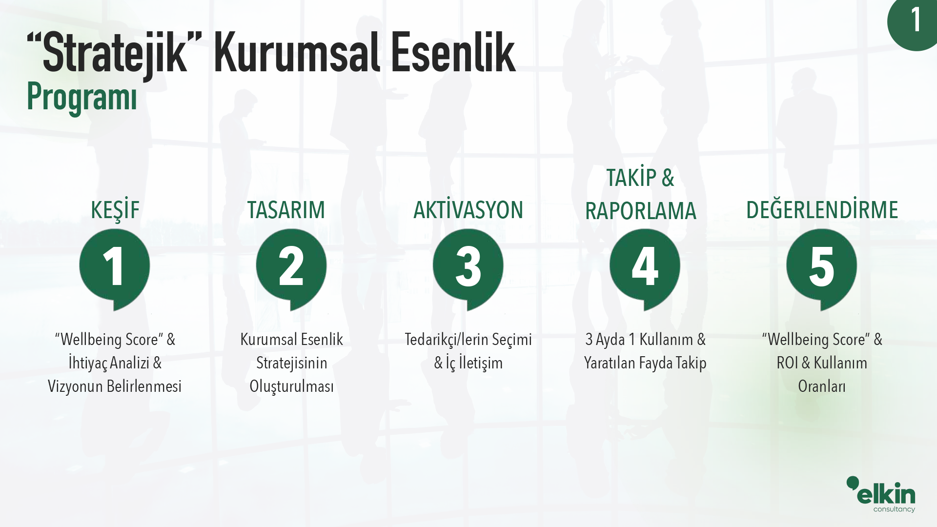 Elkin Consultancy olarak, çalışan sağlığı ve esenliğini iyileştirmek için kurumlara destek veriyor; çalışanlarının verimliliğini ve memnuniyetini artırmalarına yardımcı oluyoruz. Öncelikle; çalışanlarınızın gerçekten nasıl hissettiğini ve neye ihtiyaç duyduğunu bilimsel metodolojiler ile belirliyoruz. İhtiyaçlarınıza özel, “Stratejik Kurumsal Esenlik” Programınızı birlikte oluşturuyoruz.” Ardından, yıl boyu programın uygulanması, geribildirimlerin alınması, etkisinin ölçümlenmesi konusunda ekibinizin bir parçası olarak çalışıyoruz!